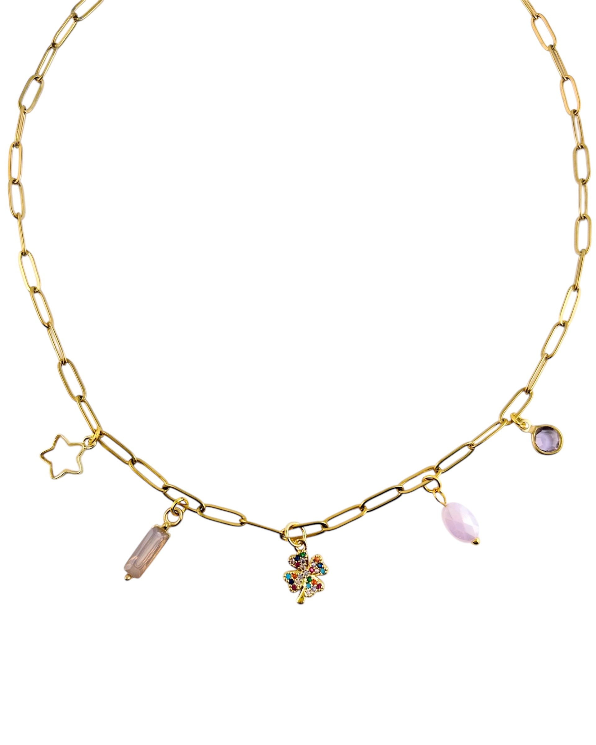 Add a little magic to your everyday look with our four leaf clover charm necklace. Crafted in a gleaming gold finish, this playful piece features a standout sparkly four-leaf clover - the ultimate symbol of good fortune - along with an adorable array of matching mini charms. This necklace will remind you that you can live a "charmed" life.