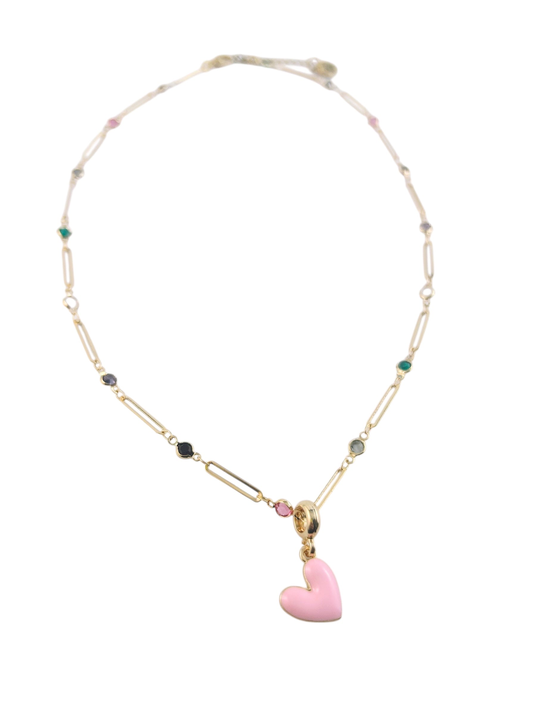 Materials: chain is 16k gold plated brass with glass connectors. Charm is enamel.