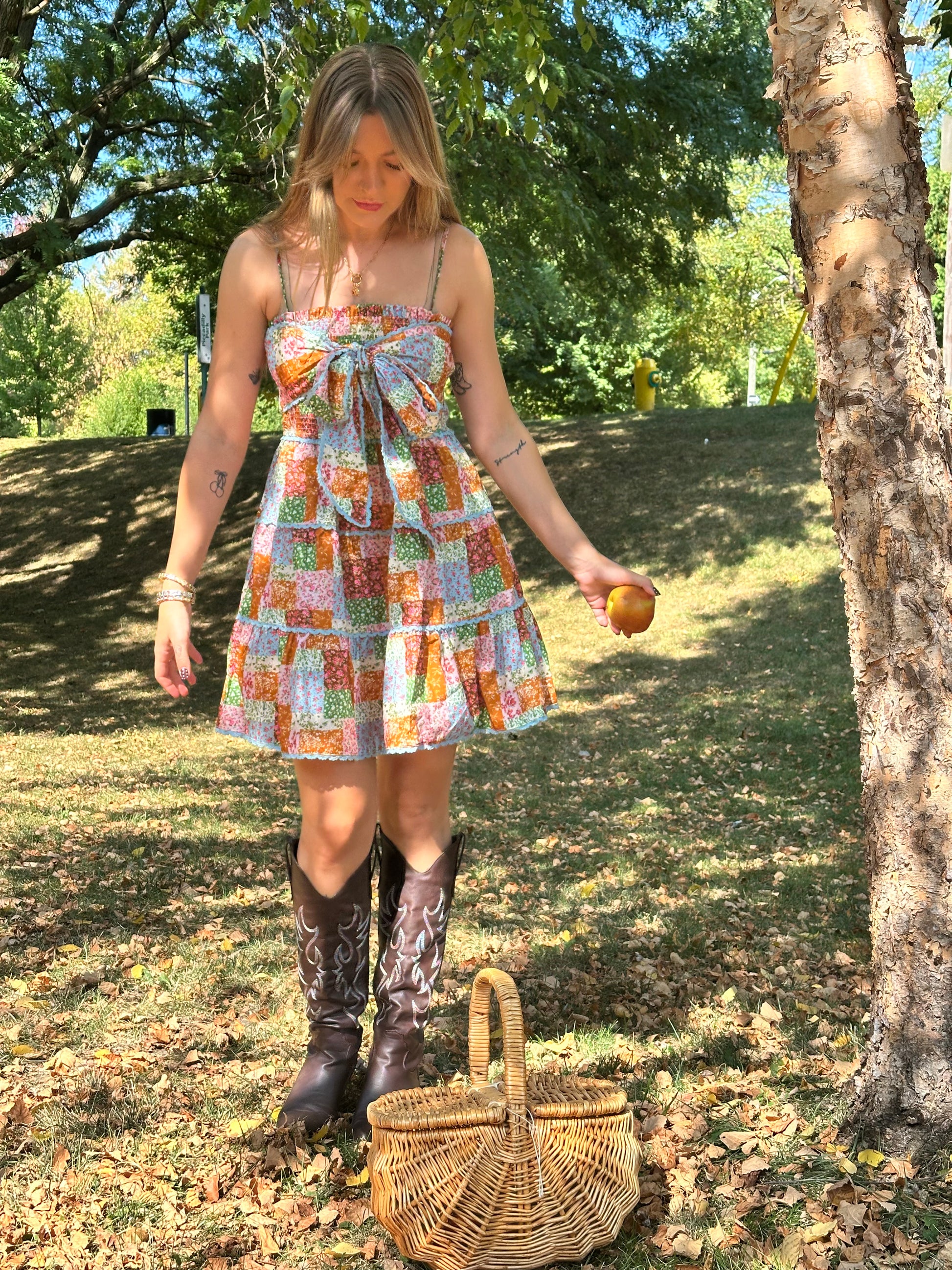 This Peachtree Lane Mini Bow Dress boasts a unique patchwork print that is sure to make a statement. The flowy tiered skirt adds an extra touch of femininity to this mini dress, while adjustable straps allow for a customizable fit. The delicate blue crochet lace trim adds a touch of charm.